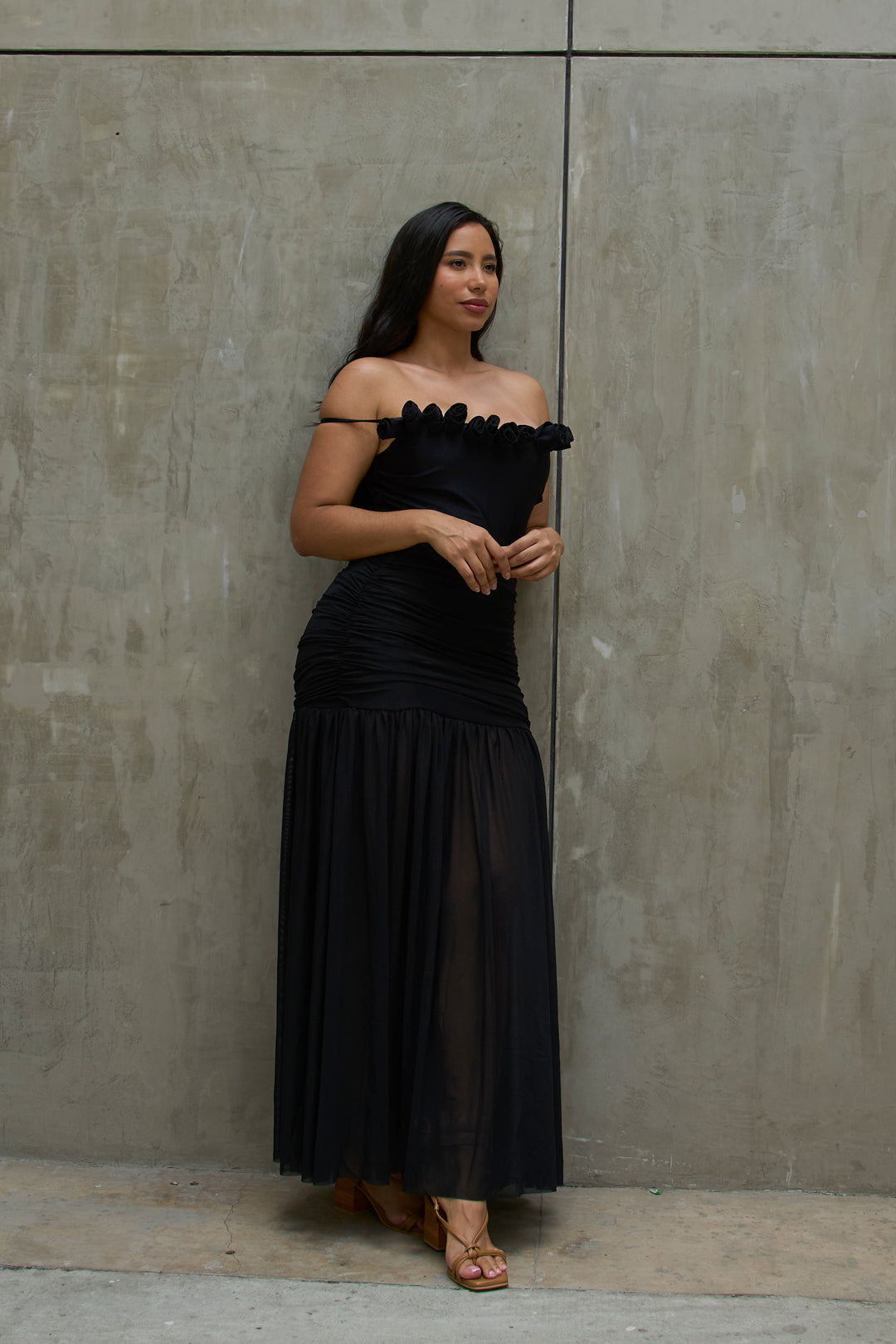 Su escote adornado con flores textiles es el toque perfecto entre romanticismo y sofisticación, ideal para eventos, cenas, fotos o noches especiales donde quieres brillar con naturalidad.
